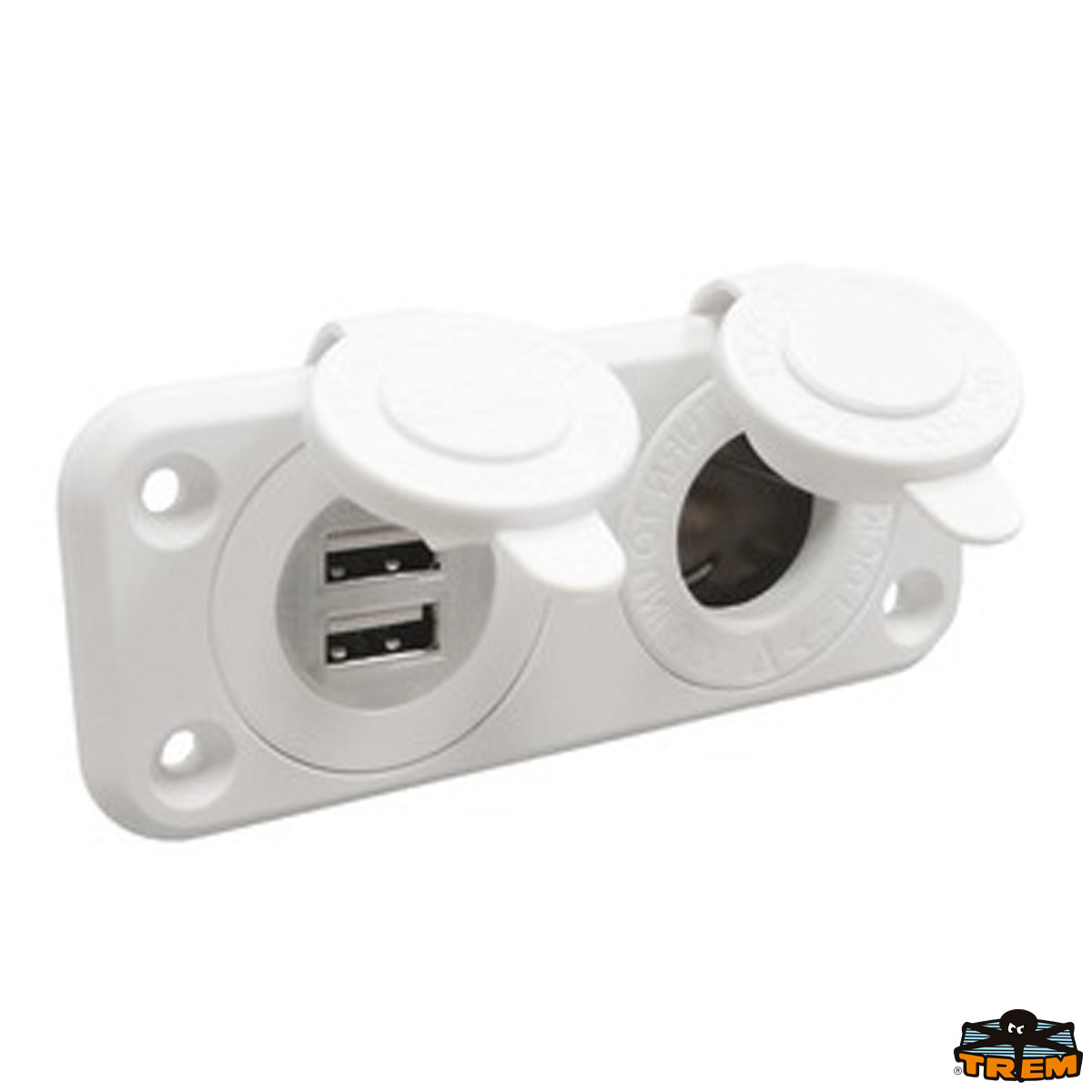 Dvojna USB vtičnica z vtičnico za vžigalnik za cigarete. Vodoodporen. Montaža z vijaki. 12-24V, CE | Barva: Bela | Amp: 2.1+1 | Cena za: 1 kos