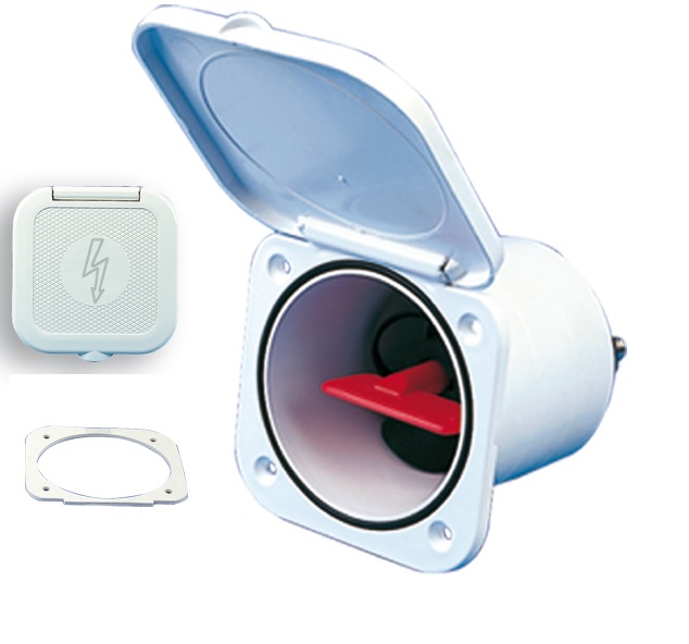 Vgradno glavno stikalo z ohišjem 100 A. Ohišje je izdelano iz belega ABS-ja. Priloženo tesnilo za vgradnjo.