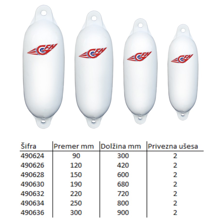 Bel napihljiv bokobran dimenzije: premer: 90mm dolžina: 300 mm Bokobran ima dve privezni ušesi. Cena za 1 kos.