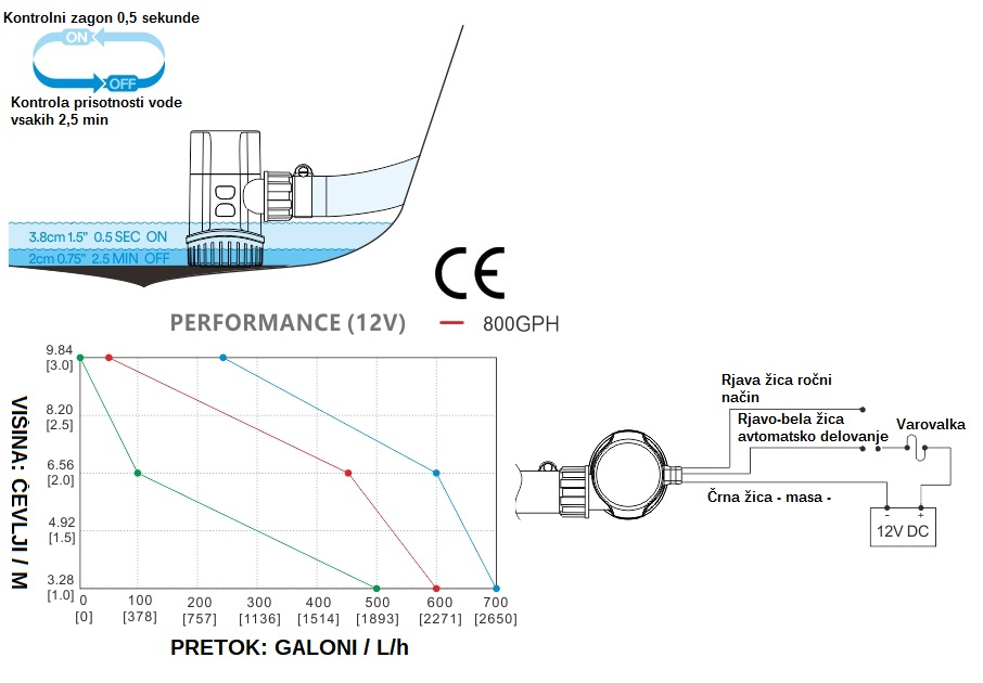 Avtomatska razstavljiva potopna kalužna črpalka z protipovratnim ventilom za vodo. Vgrajen senzor kateri vsake 2,5 min preveri prisotnost vode v kaluži z zagonom 0,5 sek.