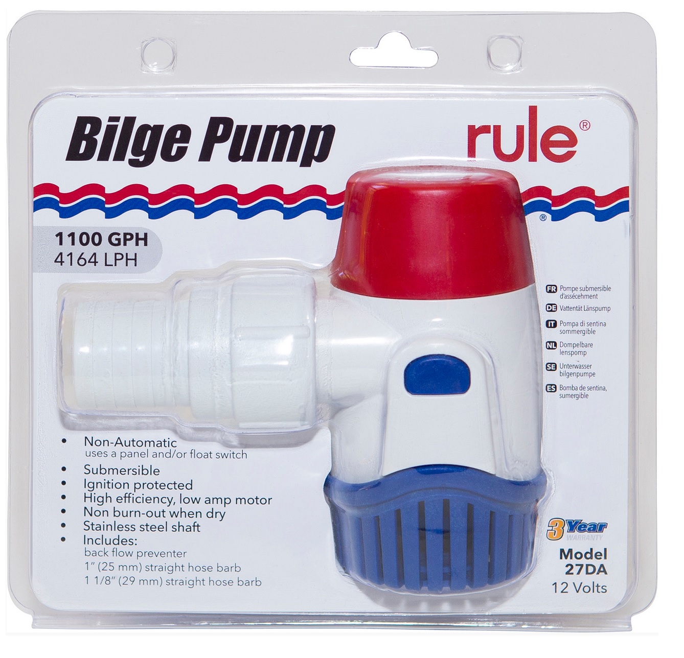 Kalužna črpalka RULE 1100 za izčrpavanje vode pretoka 70 L/min. Motorna gred iz INOX materiala. Vodoodporna zatesnitev z teflonom. Napetost 12V, Max 3,3 A Izpust za cev fi 25mm in 29 mm (dvojni adapter. Višina: 111 mm Premer: 64 mm