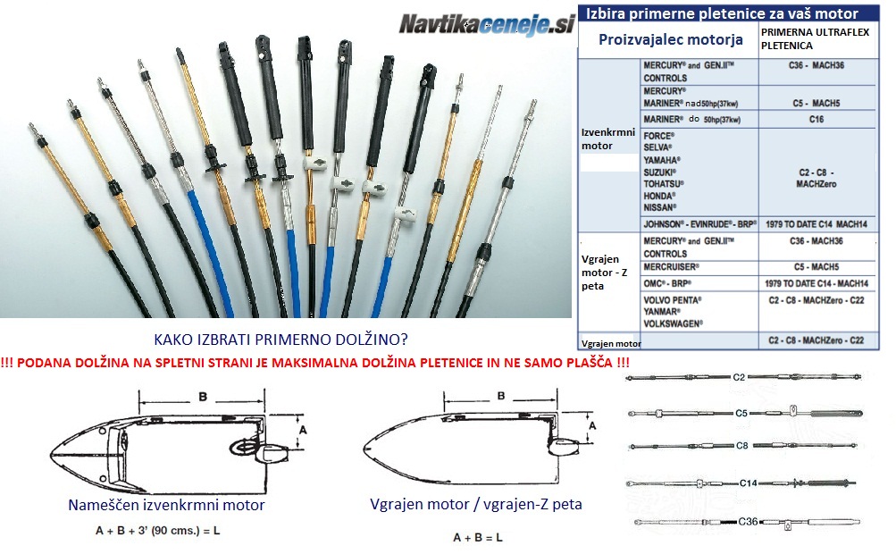 Pletenica Ultraflex tipa Mach 5. Premer pletenice na plašču: Ø 8mm Dolžina pletenice: 2,13m oz. ft: 7 Za motorje Mercury® in Mercruiser®. Proizvajalec jih označuje kot visoko zmogljive pletenice. Odlikuje jih večja prožnost kjer so zahtevani večji zavoji pletenice tako, da ta še vedno gladko teče. Sredica pletenice je iz inoks jekla. Zunanji plašč je iz ekstrudiranega kakovostnega polietilena. Cena za 1 pletenico.