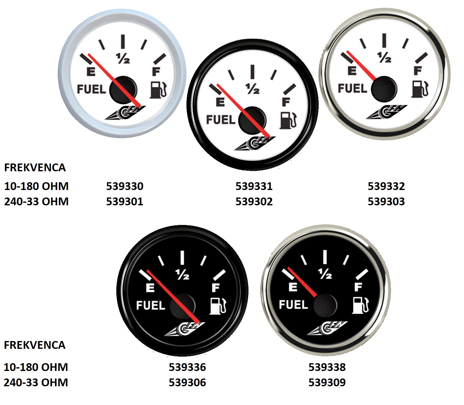 Vgradni 12V prikazovalnik nivoja goriva z lestvico E-1/2-F in možnostjo osvetlitve skale. Inox okvir z belo skalo. Premer vgradne luknje 53mm. Po normah CE. Upornost: 240-33 OHM