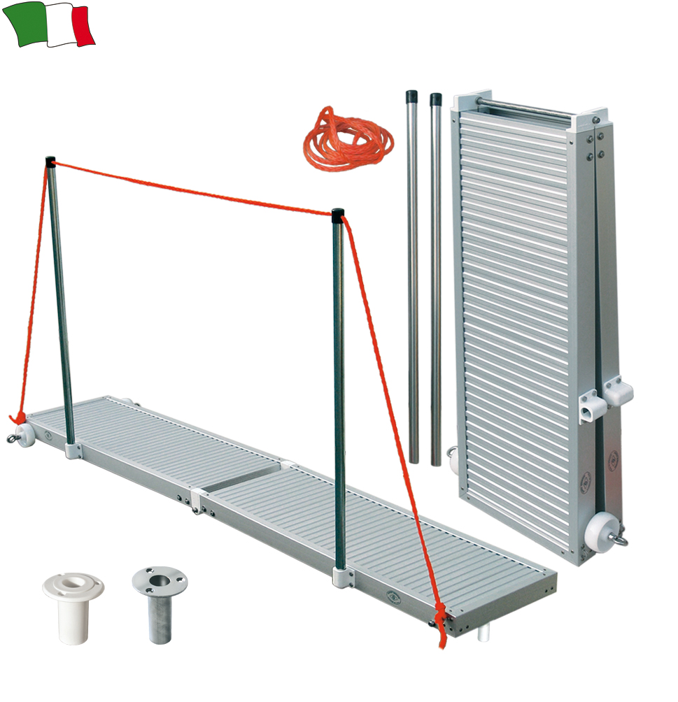 Paserela v celoti izdelana iz aluminija pregibne izvedbe z platičnimi koleščki. Dobavljena z ograjo (dva stebra in vrvjo) in vrtljivim zatičem.