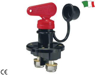 Glavno prekidač s uklonjivim ključem i certifikatom CE UNI EN 28846. Izrađeno od plastičnog materijala. Montaža na ravnu površinu. Maksimalno opterećenje: 2000A (za 3 sekunde) Kontinuirano opterećenje: 140 A Promjer cilindra: 25 mm Promjer vijka: 10 mm Maksimalna vanjska širina: 64 mm