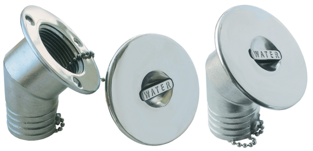 Čep za dotok vode izrađen od inox materijala, nagnut pod 45 stupnjeva. Otvaranje s potisnim gumbom i pričvrsnom lancem za čep. Priloženo O-ring brtvilo. Cijena po komadu.
