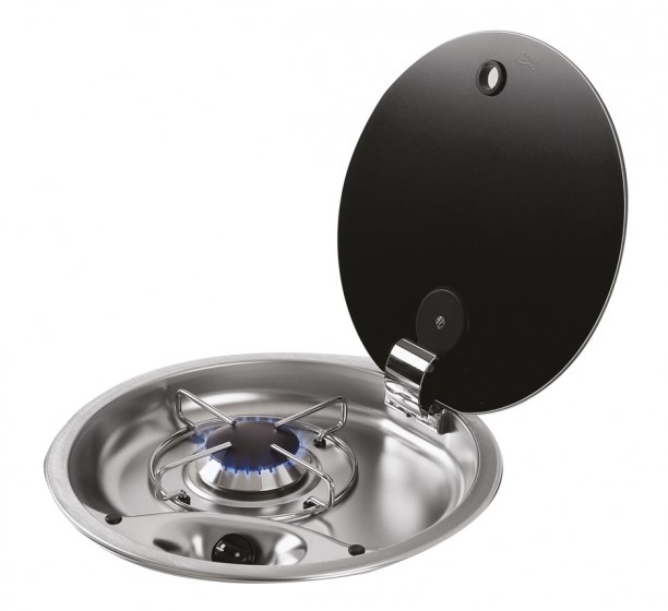 Elegantan ugradni plinski kuhalnik okruglog oblika na 1 plin. Uključen s staklenim poklopcem na šarniru.