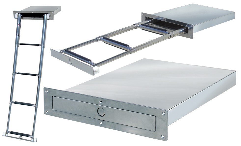 Izvlačna teleskopska ljestva model "EAGLE" s potpuno vodootpornom kutijom za ugradnju u ploštu. Brza i jednostavna instalacija. Izrađena je od nehrđajućeg čelika AISI 316 i polirana do visokog sjaja. Na stepenicama je postavljena protuklizna površina od umjetnog materijala. Cijena za 1 komad