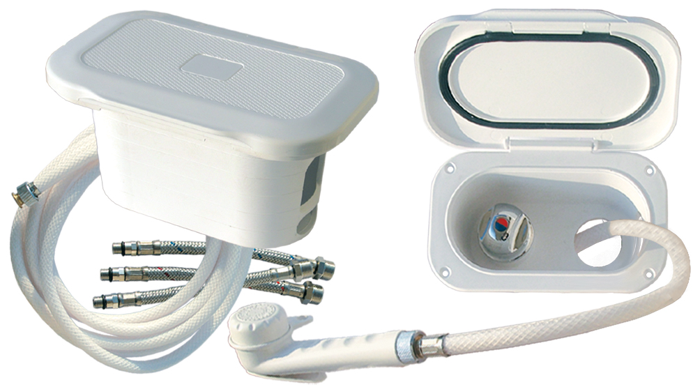 Komplet tuš s cijevi, posudom i miješalnim ventilom. Sadrži jednoručnu sanitarno armaturu (miješalica tople i hladne vode) te cijev duljine 5m.