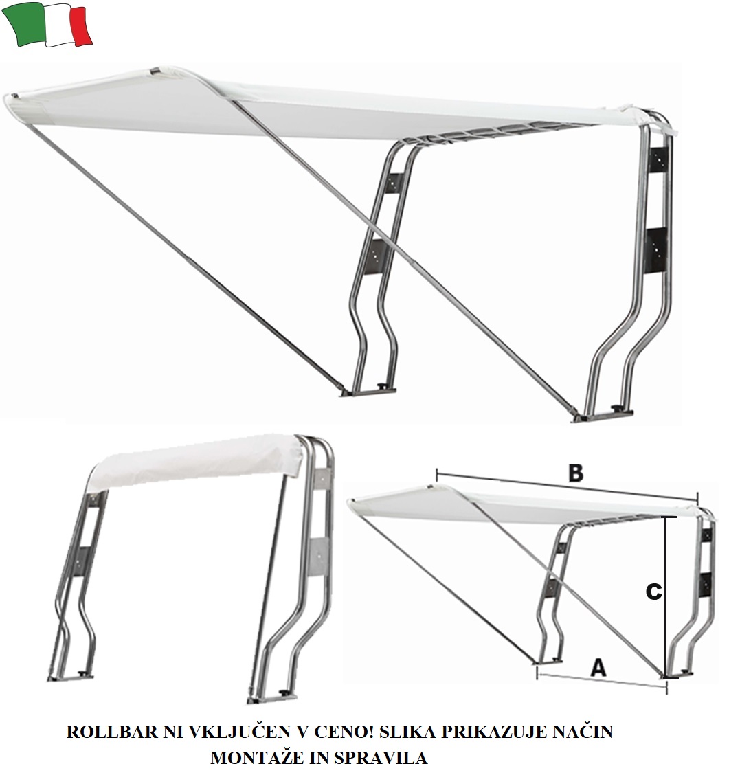 Sklope bimini prikladan za montažu na rollbar. Izrađen od kvalitetnog INOX čelika AISI 316. Platno je od vodonepropusnog poliestera. Priloženo pokrivalo za zaštitu kada nije u upotrebi.