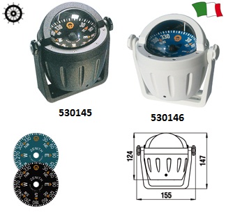 Kompas proizvajalca Riviera za montažo na lastnem držalu. Primeren za plovila ki dosegajo višje hitrosti od 25 vozlov00000 kjer ostane stabilen v prikazu. Vgrajen kompenzator. V celoti razstavljiv zaradi popravil. Napajanje 12 V Dimenzije: - premer: 155 mm - višina: 147 Graduacija: 5° Premer skale: 80 mm Barva - črn z črnim kvadrantom