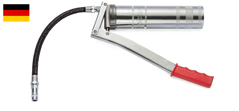 Tlačilka za mast za motorje LUBE-SHUTTLE . Cev enostavno priklopimo na mazalko na motorju in z pritiskom na ročico nabrizgamo mast na namenskih mazalkah. Tlačilka ima priklop kartuš na navoj naša koda 438961 in 438952.