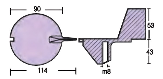 Mere: premer 90 mm, višina plavuti 53 mm, luknja z notranjim navojem M8.