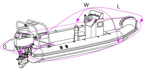 Izmerimo širino od bočnega roba čez konzolo do drugega bočnega roba. Širina cerade mora biti večja, da vam pokrije gumenjak po širini. Tudi dolžino se izmeri po srednjici plovila od premca, čez konzolo do krme.