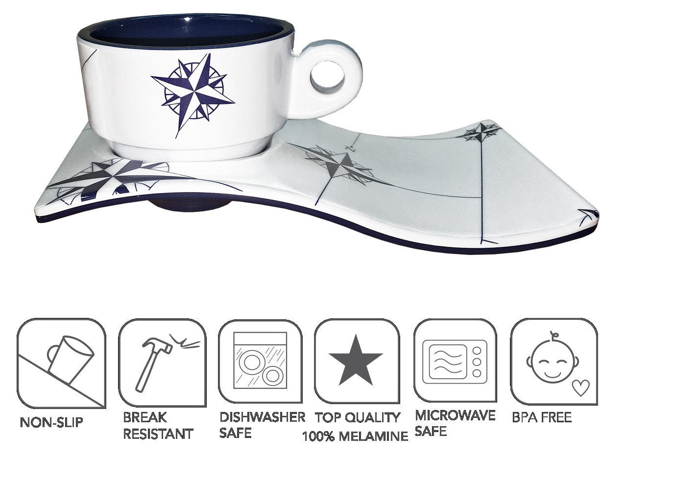 Set 6 skodelic in krožnikov iz odporne kakovostne plastike linja NORTHWIND, priznanega proizvajalca BLUE MARINE.