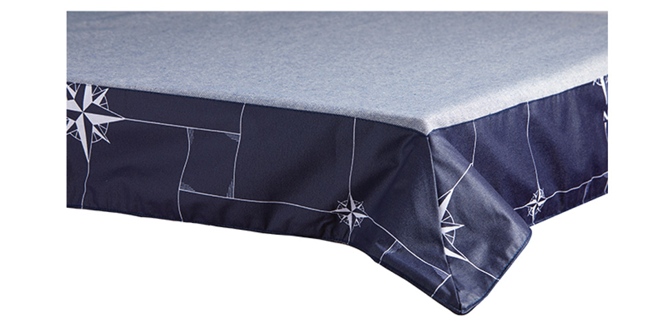 Vodoodporen namizni prt primeren za uporabo na rekreativnih plovilih. Odporen proti madežem, izdelan iz bombaža in poliestra. Vodoodporen zaradi inovativne obdelave tkanine z umetno smolo, vendar mehak na dotik in ne dopušča, da madeži prodrejo v tkanino.