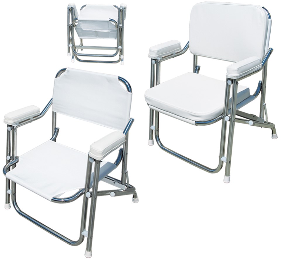 Kompaktnen zložljivi stol z oblazinjenimi nasloni za roke. Oblazinjeno hrbtišče in sedišče.